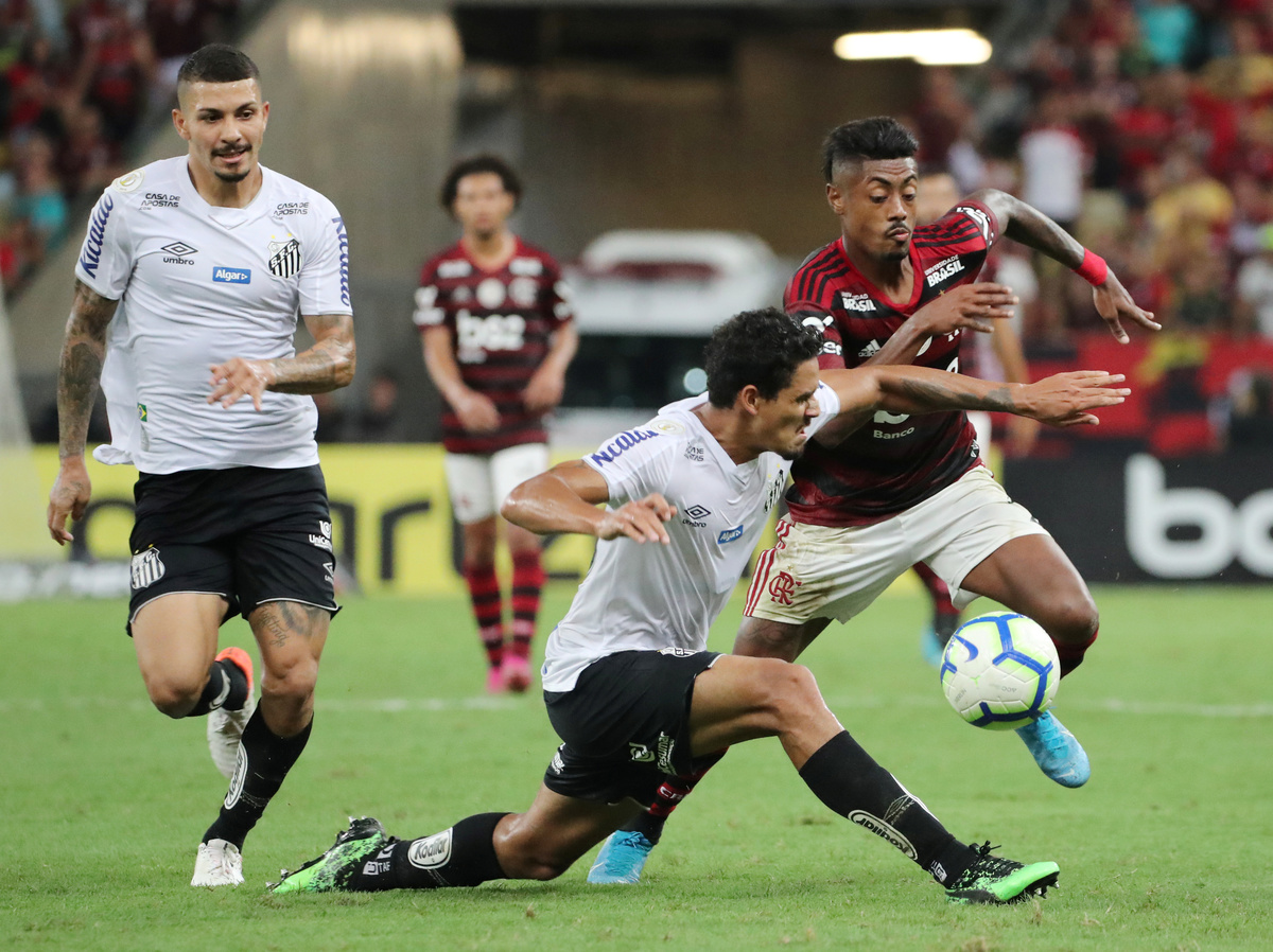 Soccer Football - Brasileiro Championship - Flamengo v Santos - Maracana Stadium, Rio de Janeiro, Brazil - September 14, 2019 Flamengo's Bruno Henrique in action with Santos' Lucas Verissimo REUTERS/Sergio Moraes
