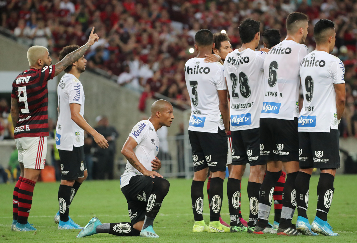 Soccer Football - Brasileiro Championship - Flamengo v Santos - Maracana Stadium, Rio de Janeiro, Brazil - September 14, 2019 Santos' Carlos Sanchez and team mates form a wall to defend a free kick REUTERS/Sergio MoraesSoccer Football - Brasileiro Championship - Flamengo v Santos - Maracana Stadium, Rio de Janeiro, Brazil - September 14, 2019 Flamengo coach Jorge Jesus and Bruno Henrique shakes hands after the match REUTERS/Sergio Moraes