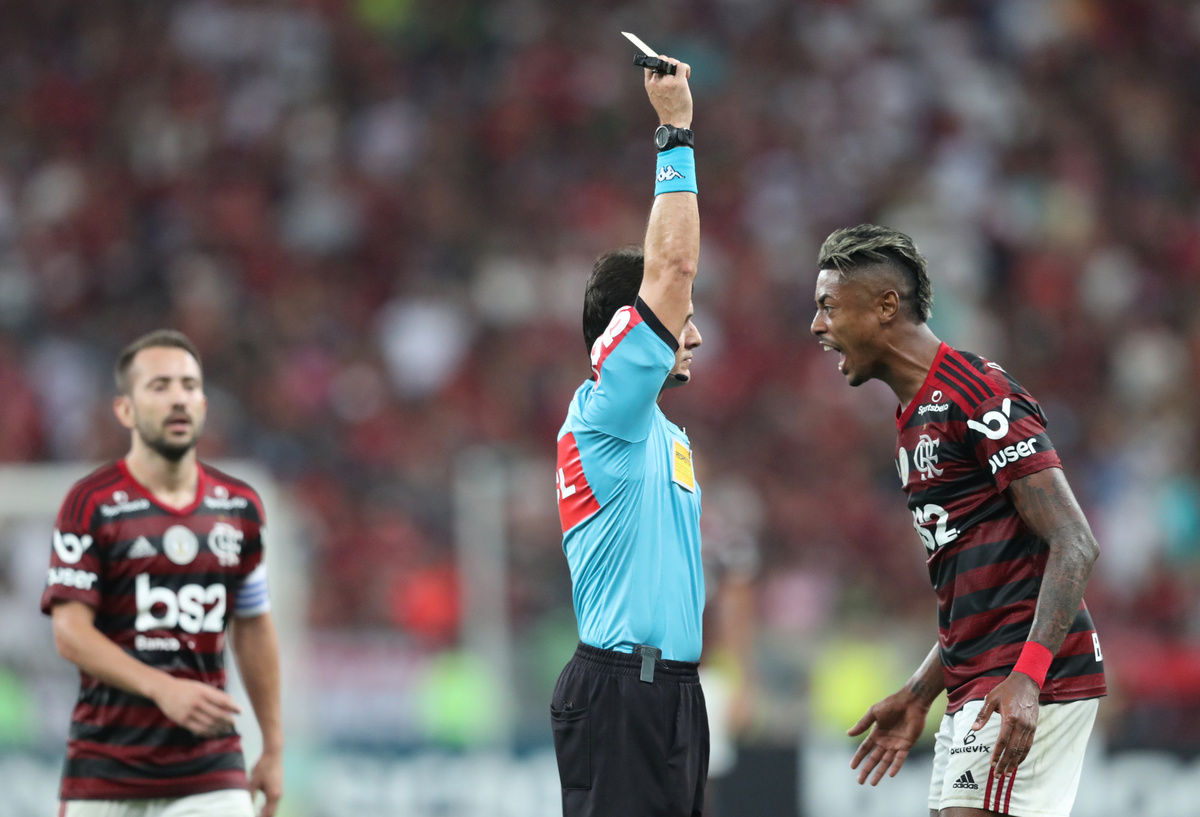 Soccer Football - Brasileiro Championship - Flamengo v Bahia - Maracana Stadium, Rio de Janeiro, Brazil - November 10, 2019 Flamengo's Bruno Henrique is shown a yellow card by referee Caio Max Augusto REUTERS/Sergio Moraes