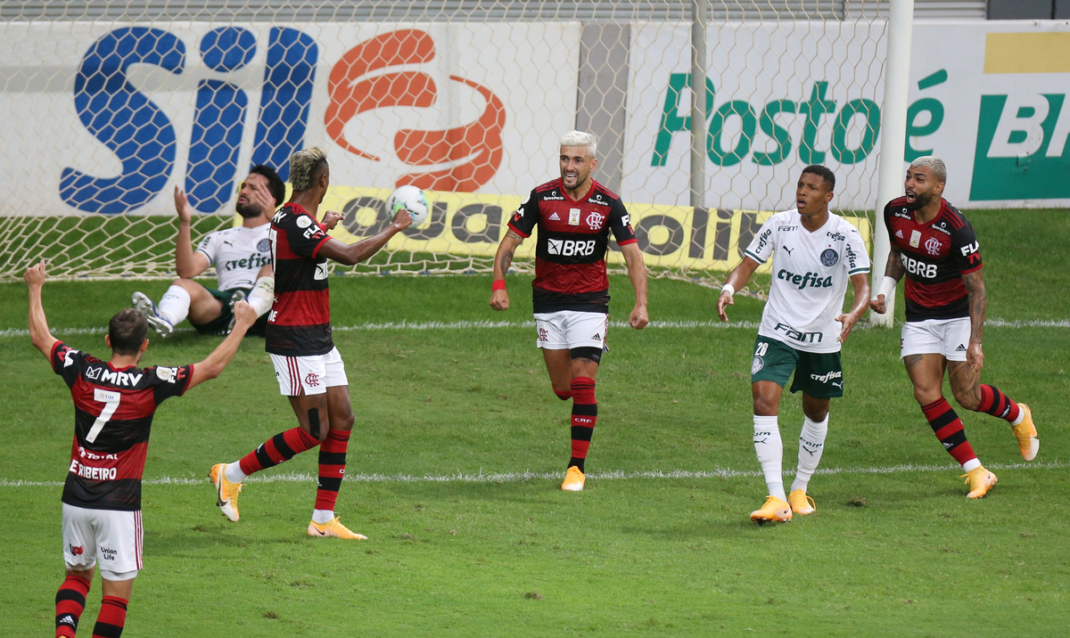 Soccer Football - Brasileiro Championship - Flamengo v Palmeiras - Estadio Mane Garrincha, Brasilia, Brazil - January 21, 2021 Flamengo's Giorgian De Arrascaeta celebrates with teammates after Palmeiras' Luan scored an own goal and the first for Flamengo REUTERS/Adriano MachadoSoccer Football - Brasileiro Championship - Flamengo v Palmeiras - Estadio Mane Garrincha, Brasilia, Brazil - January 21, 2021 Flamengo's Giorgian De Arrascaeta celebrates after Palmeiras' Luan scored an own goal and the first for Flamengo REUTERS/Adriano Machado