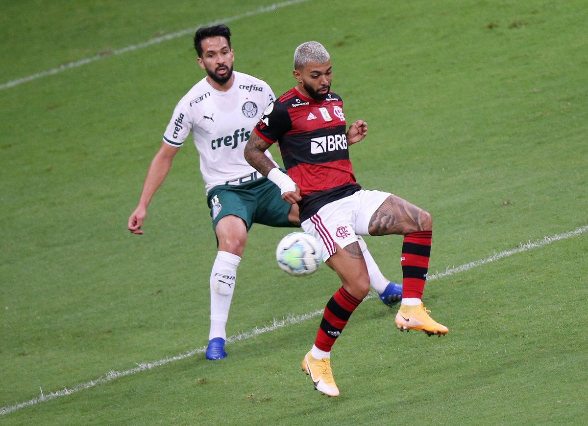 Soccer Football - Brasileiro Championship - Flamengo v Palmeiras - Estadio Mane Garrincha, Brasilia, Brazil - January 21, 2021 Flamengo's Gabriel in action with Palmeiras' Luan REUTERS/Adriano Machado