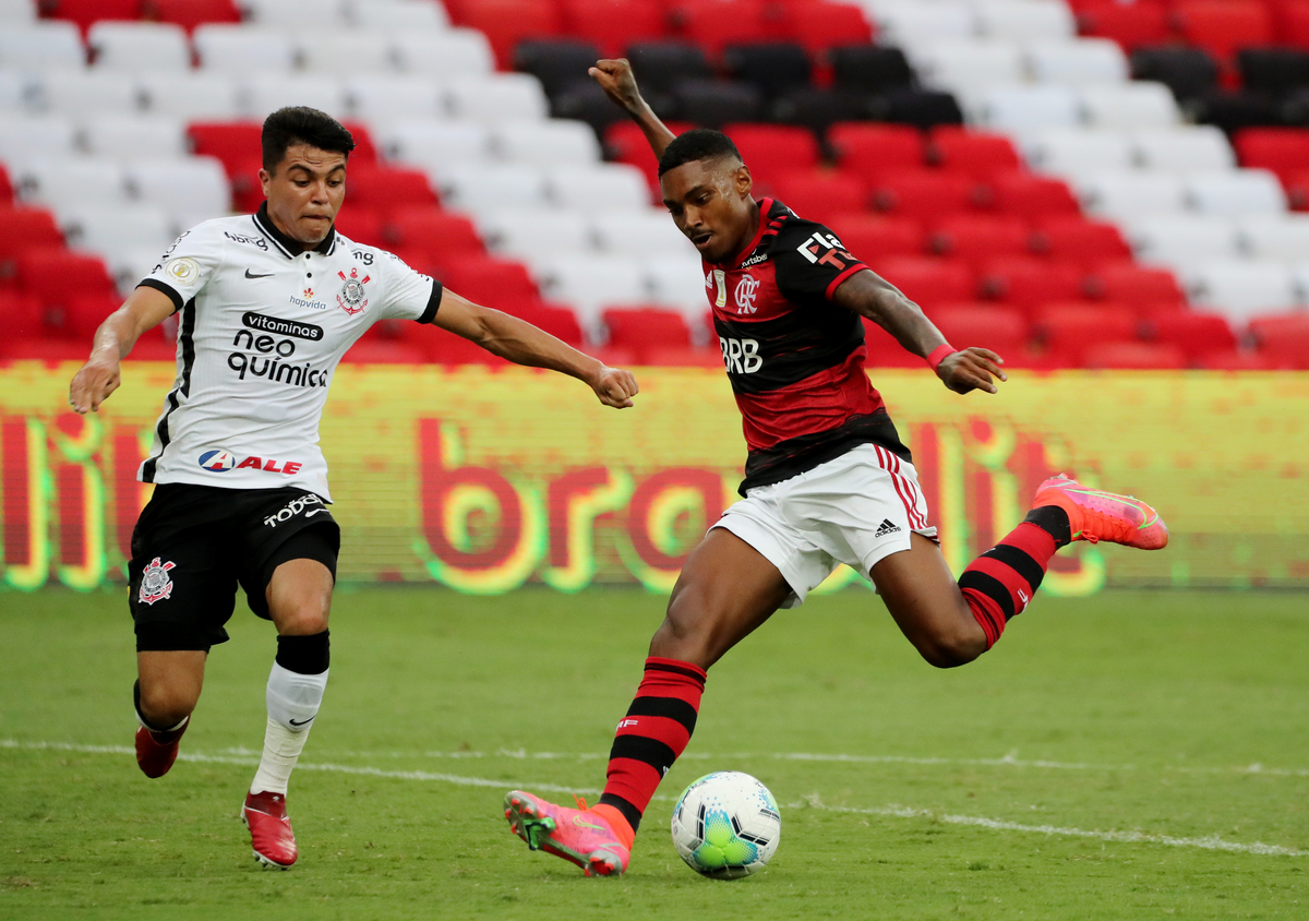 Soccer Football - Brasileiro Championship - Flamengo v Corinthians - Estadio Maracana, Rio de Janeiro, Brazil - February 14, 2021 Flamengo's Vitinho in action with Corinthians' Roni REUTERS/Sergio Moraes