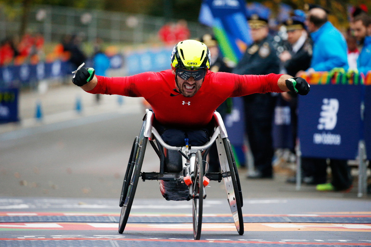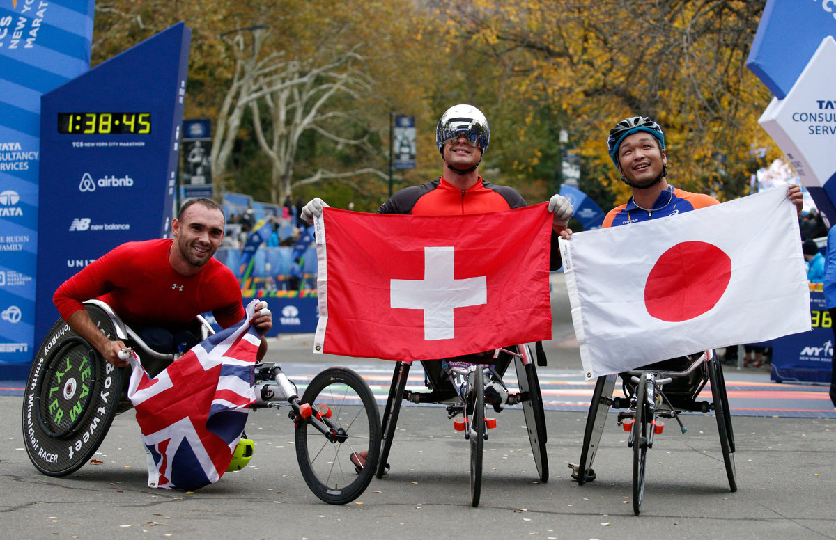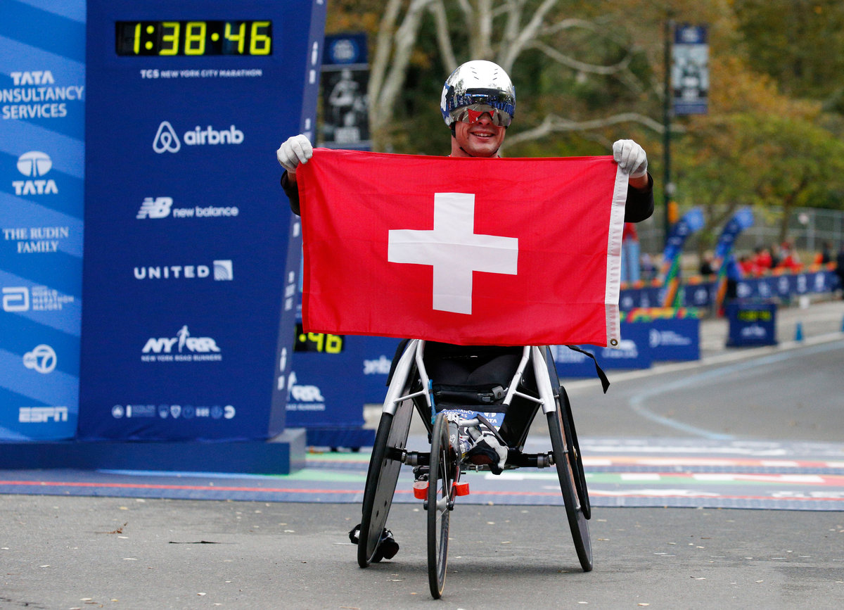 Repeat winner Marcel Hug gave Switzerland the men's title in equally dominant fashion, defending his championship in 1:37:21, more than two minutes ahead of British runner-up John Charles Smith. The title was Hug's third in New York City.