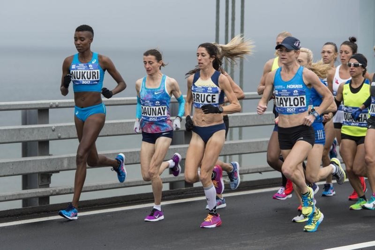 Nov 5, 2017; New York, NY, USA; Diane Nukuri (BDI) and Christelle Daunay (FRA) and Stephanie Bruce (USA) and Kellyn Taylor (USA) compete for second in the New York City marathon as they cross at the Verrazano Bridge. Mandatory Credit: Gregory J. Fisher-USA TODAY Sports