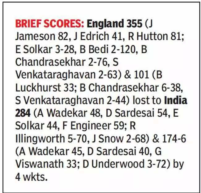 After England scored 355, India looked in trouble at 125 for five, having lost the wickets of Sunil Gavaskar, Ashok Mankad, skipper Ajit Wadekar, Dilip Sardesai and Gundappa Viswanath, before 'keeper-bat Farokh Engineer (59) and Eknath Solkar (44) rescued the visitors with a 97-run partnership for the sixth wicket. India eventually made 284, before leg-spin legend Bhagwat Chandrasekhar weaved his magic, taking six for 38 to spin out England for just 101, leaving India with 173 to get on the final day.