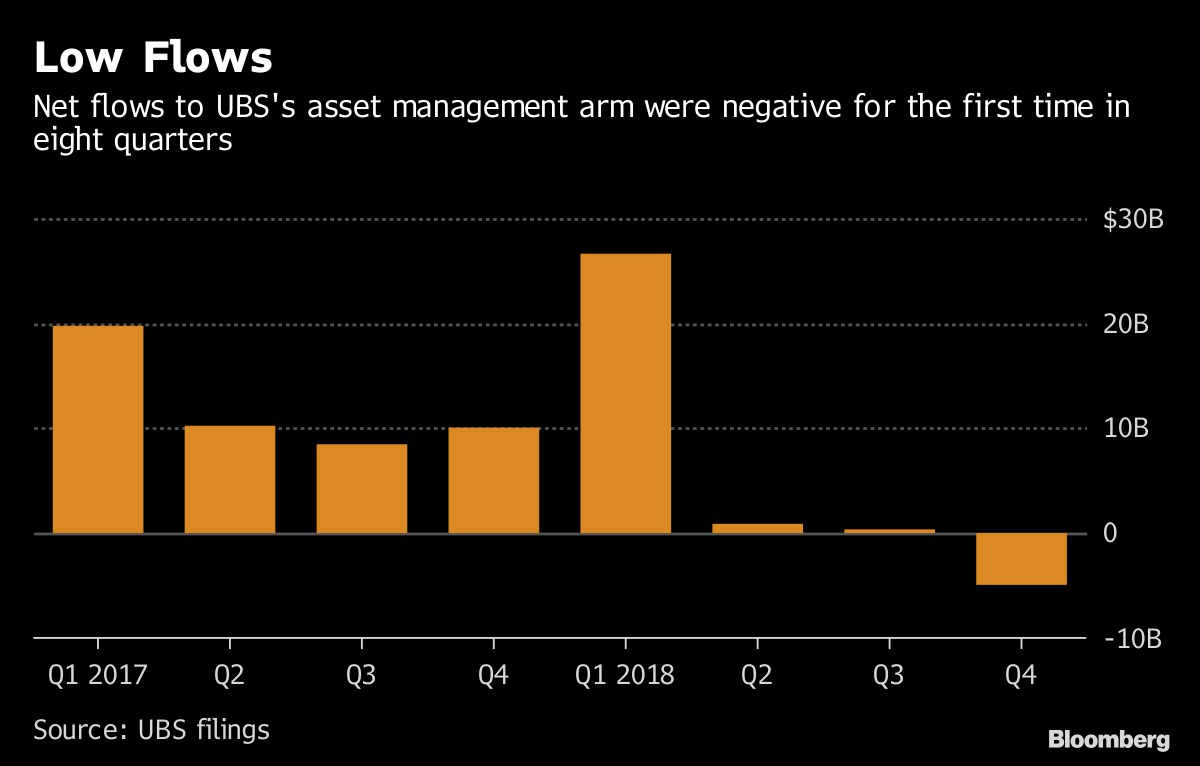 Ermotti, who oversaw UBS’s shift away from investment banking following the global financial crisis to focus on managing money for the rich, last year pledged to drive up wealth-management profit. But the firm for now remains vulnerable to market volatility, with clients withdrawing almost $8 billion at a key global wealth unit in the fourth quarter, and another $5 billion from asset management.