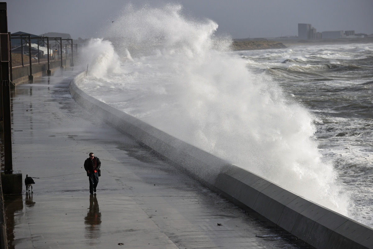 A man takes his dog for a walk as waves hit the sea wall in Saltcoats, Scotland, Britain February 9, 2020. REUTERS/Eddie Keogh