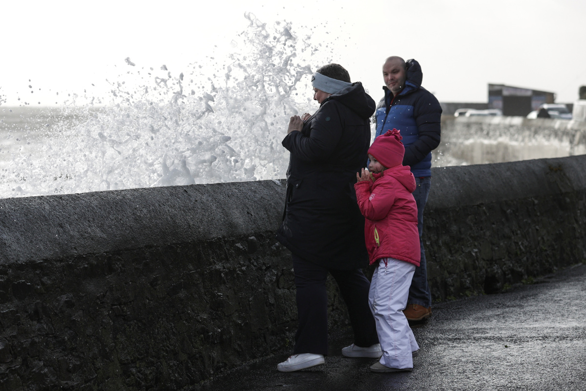 A child takes shelter behind an adult as waves hit the sea wall in Saltcoats, Scotland, Britain February 9, 2020. REUTERS/Eddie Keogh