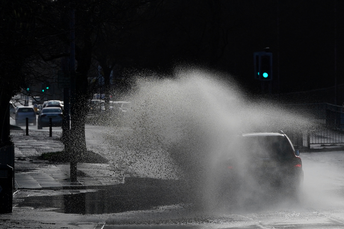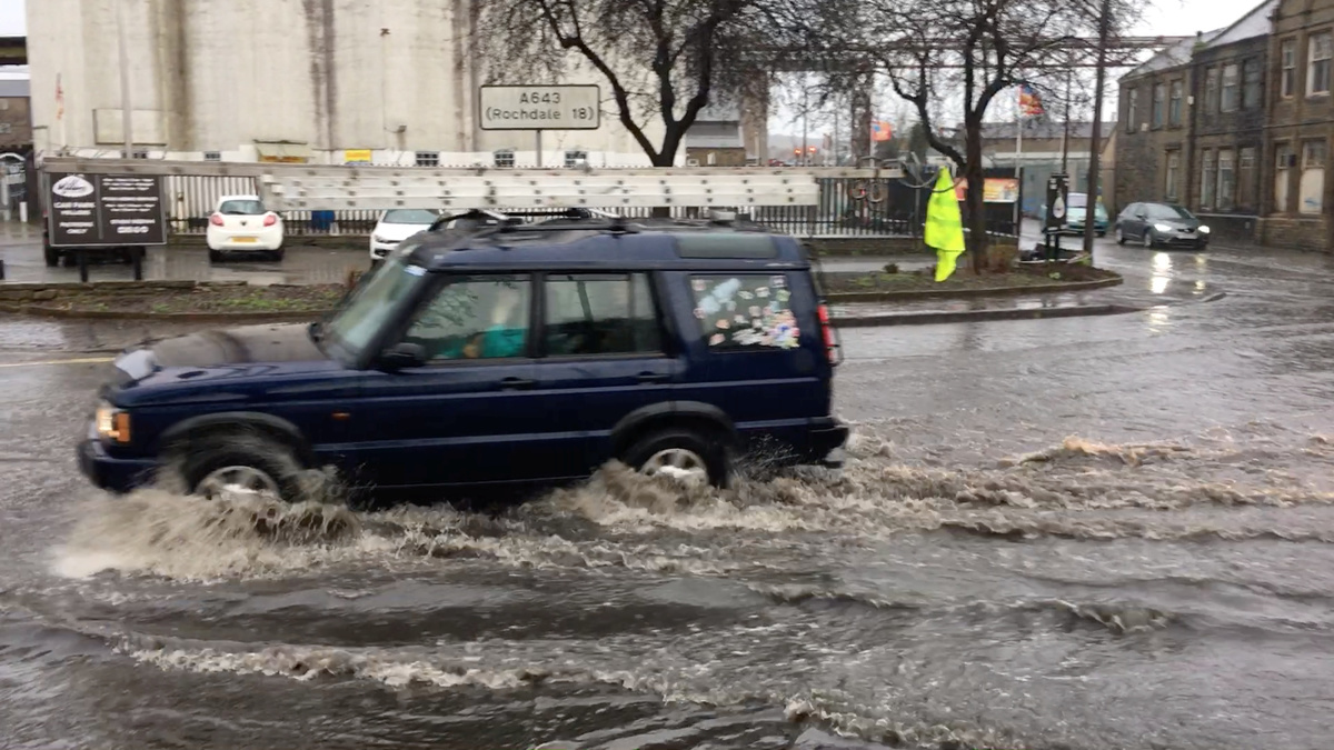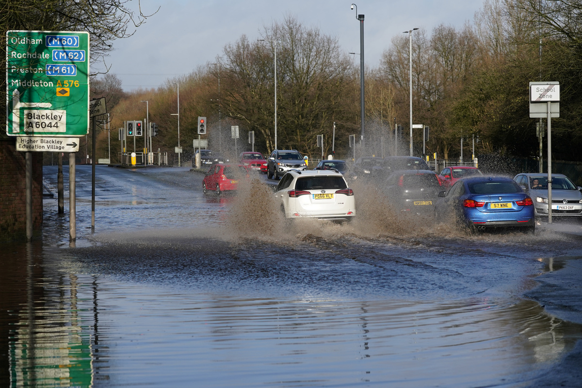 Cars drive through floodwater as hurricane-force winds and rain affected the country's transport network leading to disruptions and prompting warnings of power cuts and a risk to life, in Manchester, Britain February 9, 2020. Storm Ciara has brought heavy rain and winds, caused widespread flooding and has led to the cancellation of sporting events. REUTERS/Jon Super