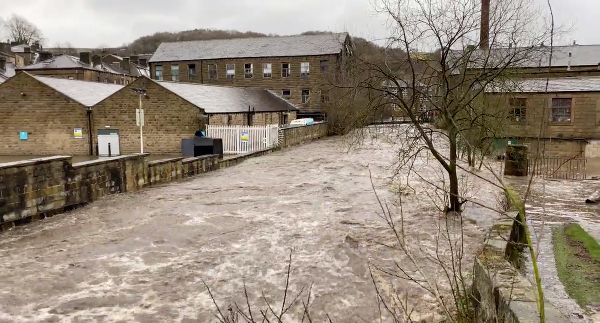 The River Irwell is seen in Ramsbottom, Lancashire as hurricane-force winds and rain have affected the country's transport network leading to disruptions and prompting warnings of power cuts and a risk to life, in Britain February 9, 2020. REUTERS/Jon Super