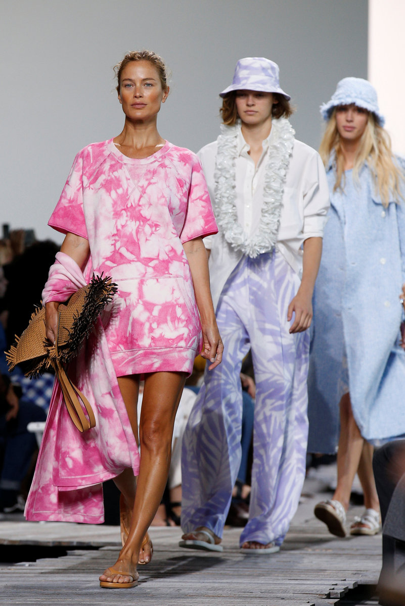 Models in colorful ensembles of breezy shirts, wide-legged trousers and flowing palm-print dresses drifted down the catwalk. Flip-flops largely finished the look that Kors called "barefoot glamor" with an "escapist kind of attitude."