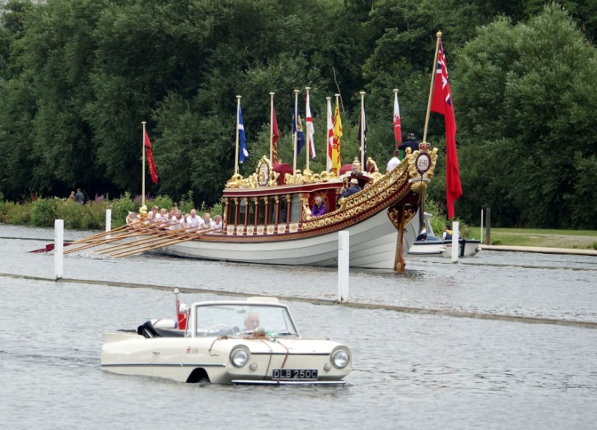HENLEY-ON-THAMES, England (Reuters) - Queen Elizabeth II's stately royal barge "Gloriana" found itself sharing the River Thames with some quirky upstarts at the weekend - amphibious motor cars.
