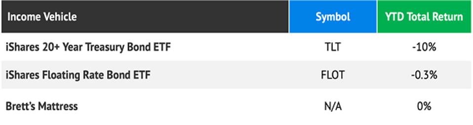 FLOT is doing better than TLT. Unfortunately, FLOT lags the cash stuffed under my mattress year-to-date: