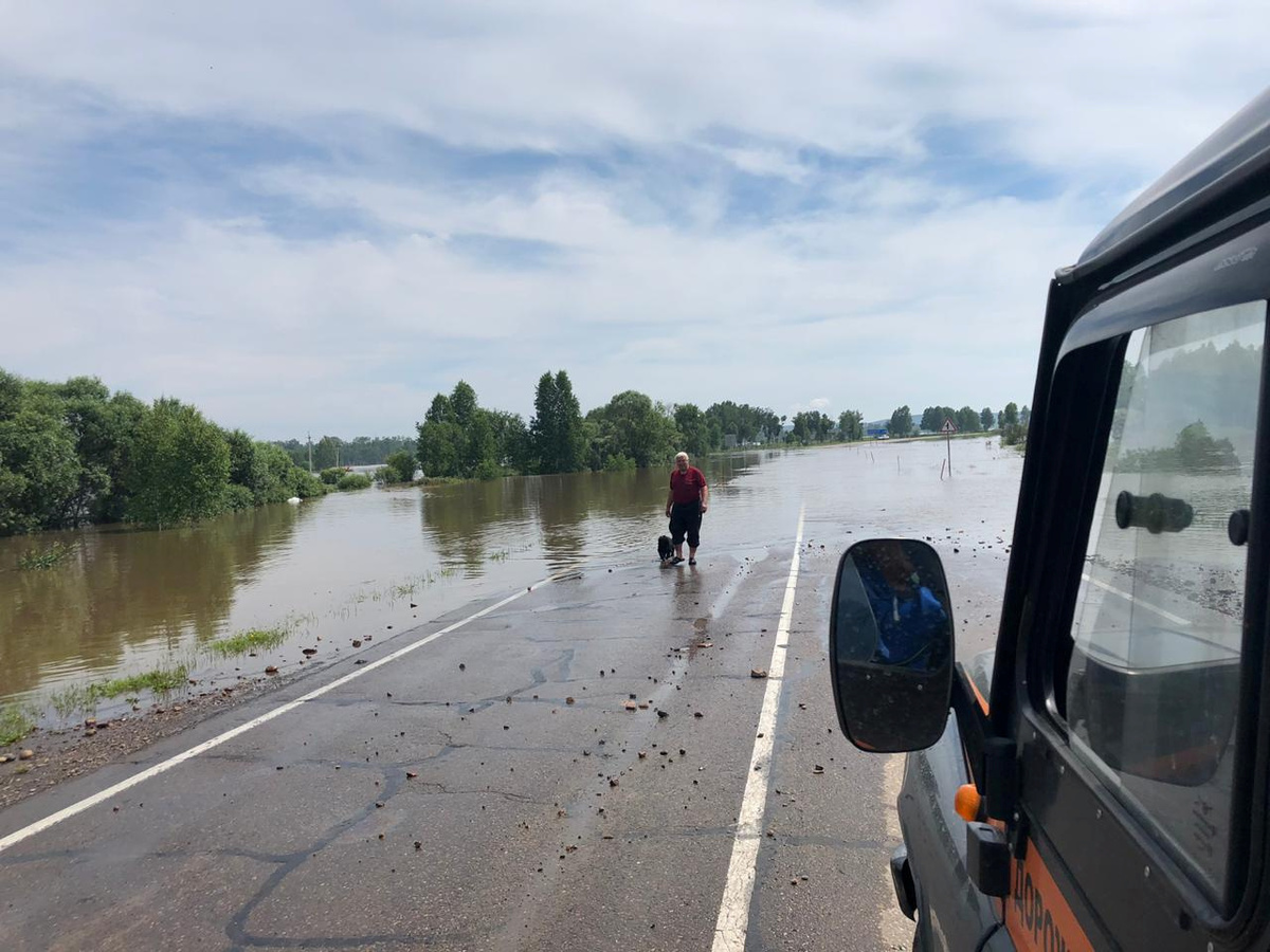 A local resident with a dog stands on a road in the area affected by heavy floods in Irkutsk Region, Russia in this handout picture obtained by Reuters on July 2, 2019. Russian Emergencies Ministry/Handout via REUTERS