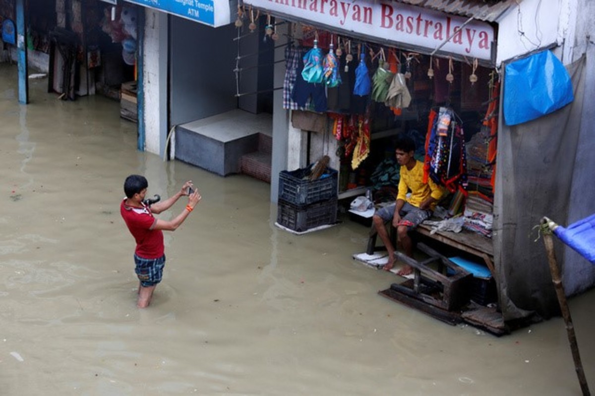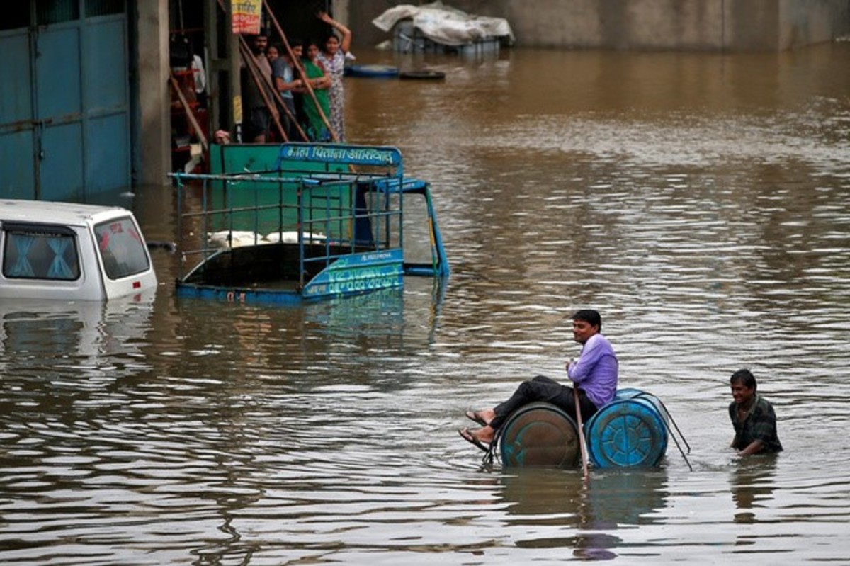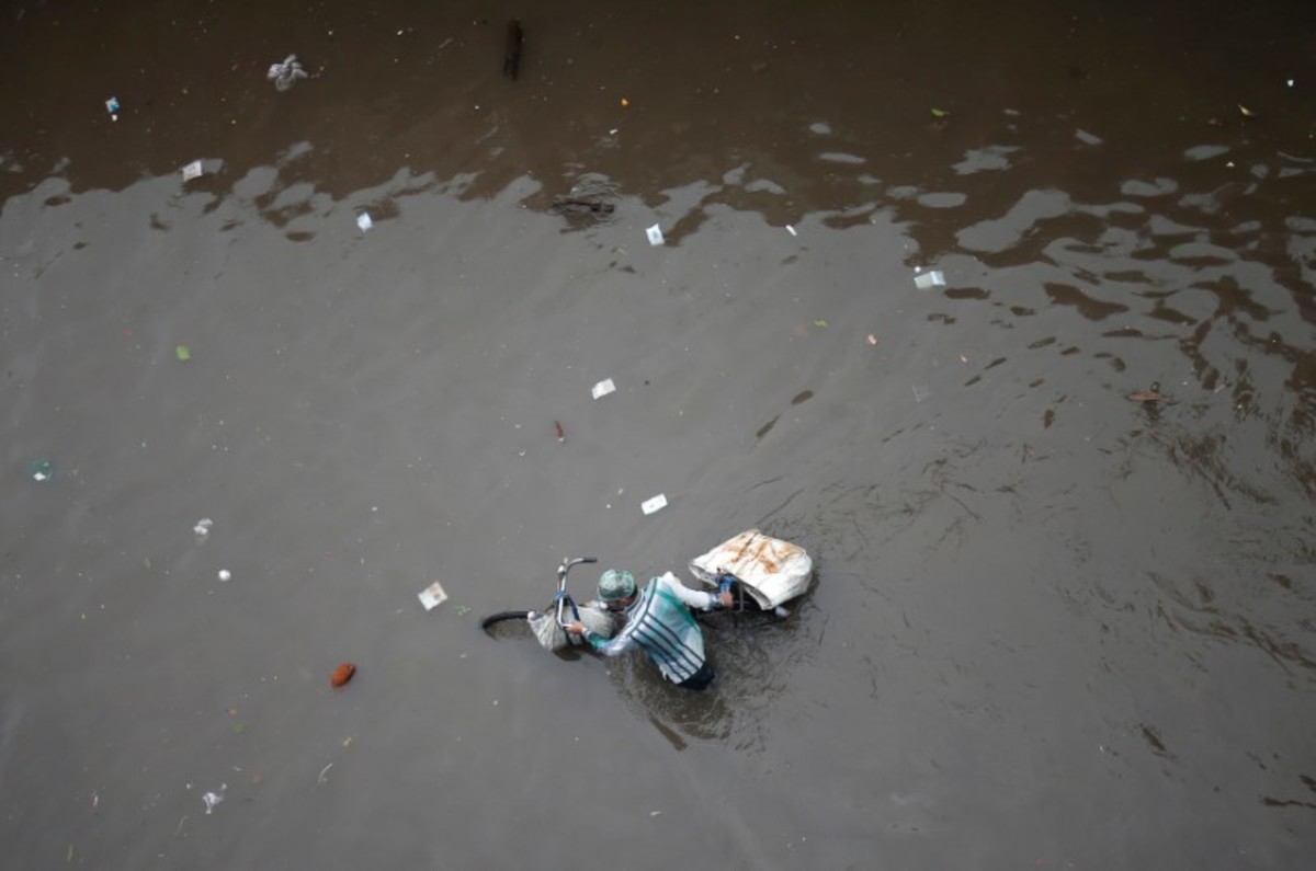 A man pushes his bicycle through a water-logged street after heavy rains in Ahmedabad, India. REUTERS/Amit Dave