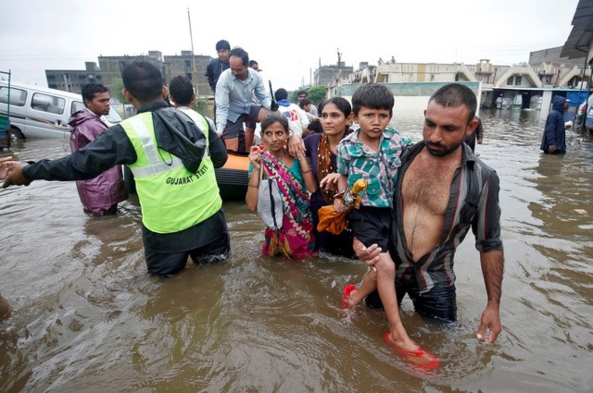 Fire officials and rescuers evacuate people from a flooded neighbourhood after heavy rains in Ahmedabad. REUTERS/Amit Dave