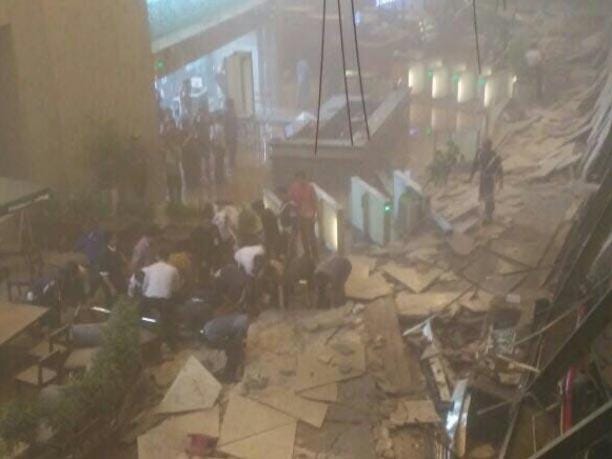 “Images aired on television and circulated on social media showed a mangled metal structure that had collapsed around a Starbucks cafe near the entrance to the lobby.