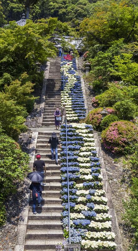 UJI, Kyoto -- A tricolored floral display of a dragon has risen along the stone steps of Kyoto Prefecture's Mimurotoji temple, a site well-known for its flowery displays. The "Rising Dragon," made from 600 pots of hydrangeas, was imbued with the desire for a swift end to the coronavirus crisis and to bring people good fortune.