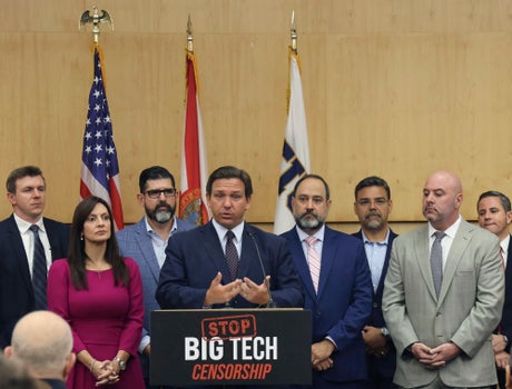 Standing at a lectern with a sign reading “STOP BIG TECH CENSORSHIP," Republican Florida Gov. Ron DeSantis signed a bill on Monday that seeks to punish social media platforms that remove conservative ideas from their sites.