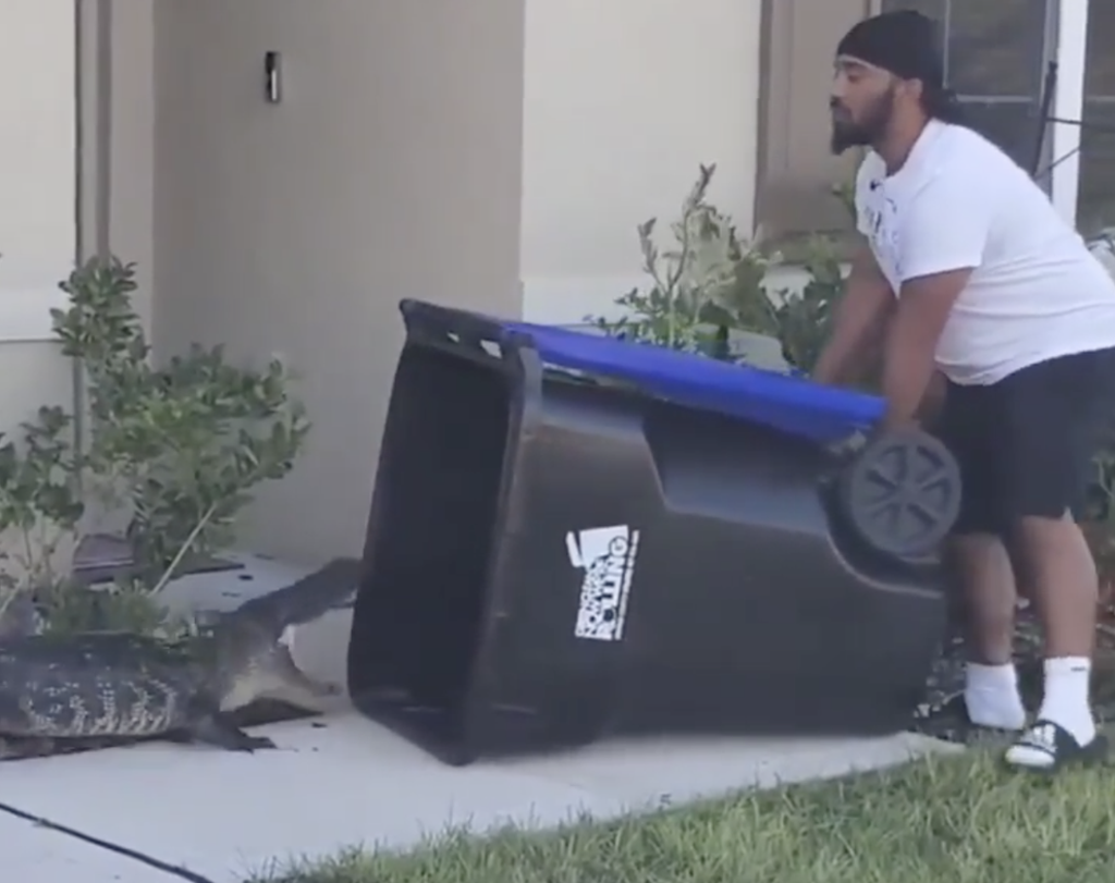 A US army veteran who discovered an alligator outside his house has been filmed using a wheelie bin to capture the reptile – before freeing it next to a nearby lake.