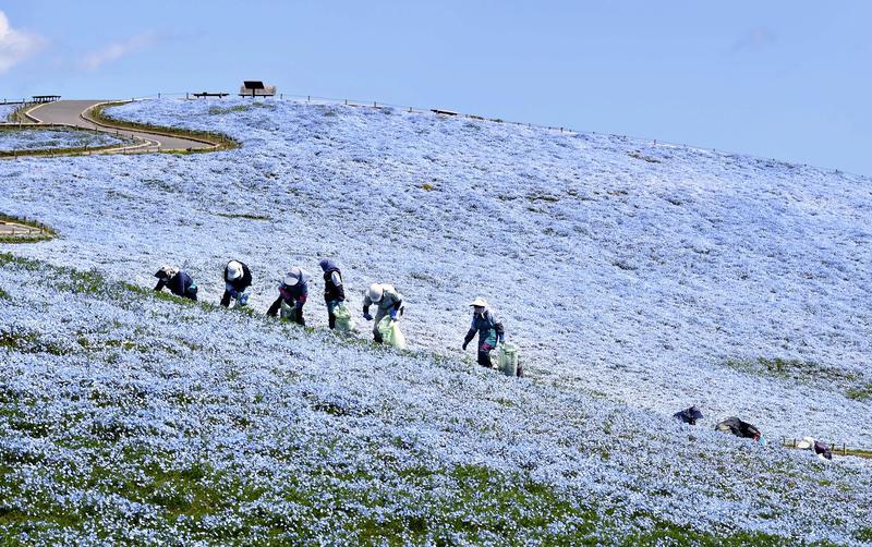 Nemophila flowers have dyed the face of a hill at the Hitachi Seaside Park in Hitachinaka, Ibaraki Prefecture, a bright blue.