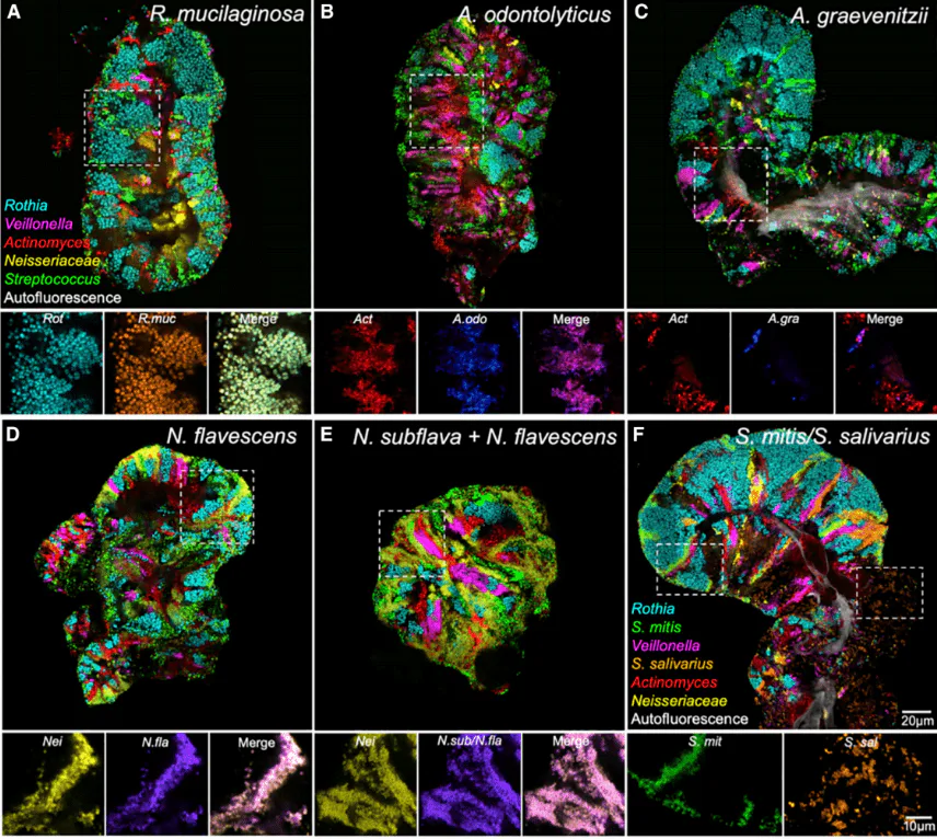 The epithelial cells serve as the "core" (seen in grey in the images). From there bacteria like Actinomyces (red) are the closest to the center. From there Rothia (in blue) forms a second layer. The whole thing is capped off with a Streptococcus (in green) "thin crust" to use the researcher's words.