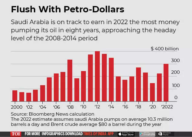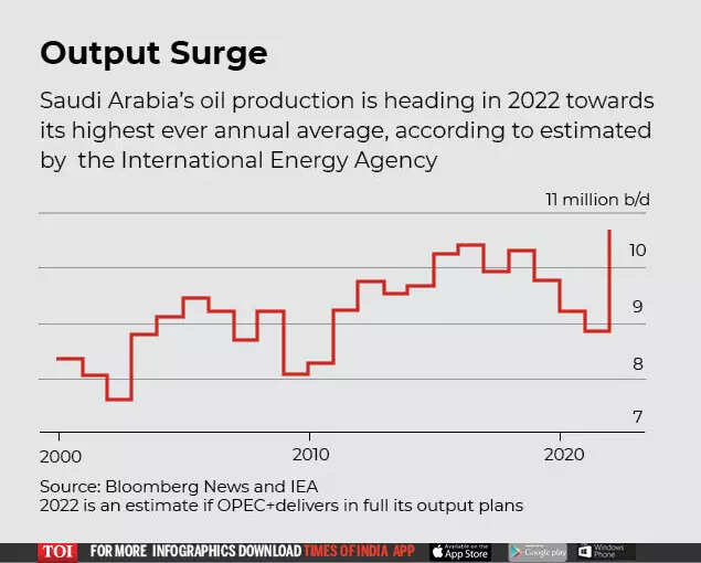If oil prices and Saudi output stay at current levels, the kingdom’s gross oil revenues will top $300 billion in 2022, according to Bloomberg News estimates – putting Riyadh on track to enjoy one of its best ever years. It could be even better. The International Energy Agency believes Saudi oil production may average 10.7 million barrels a day in 2022, the highest ever annual average.