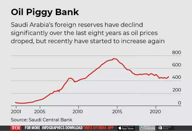After being feted by Western leaders and the heads of some of the world’s biggest firms, Prince Mohammed was quickly dropped. Then, oil prices tanked in early 2020 after Covid first struck China and then the world. Saudi Arabia only survived those bad years by running down its stock of petrodollars and borrowing billions to finance widening fiscal deficits. The reserves fell from a peak of nearly $750 billion in mid-2014 to a low of $437 billion earlier this year. Since, it’s recovered to $465 billion.