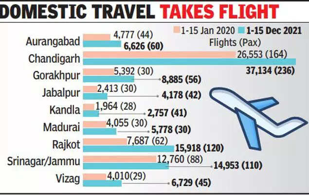 In the first 15 days of December, about 16,000 passengers flew between Mumbai and Rajkot, which was a 107% gr-owth as compared to the pre-Covid period—the first 15 day of January 2020. Jabalpur in Madhya Pradesh comes in second with a 73% growth as co-mpared to pre-Covid times, according to MIAL data. But when the December data is co-mpared to January 2019 data, Jabalpur’s passenger traffic growth stands at 98%, the highest among this lot. Then there is Vishakhapatnam with a 68% growth (January 2020 vs December) and the rest are Aurangabad, Chandigarh, Gorakhpur, Kandla, Madurai and Srinagar (see box).