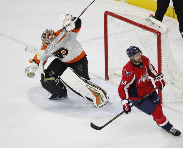 Claude Giroux, converting a Capitals giveaway, fired a shot over Holtby's glove to tie the score at 2 with 20.7 seconds left in the second period. The teams were skating four-on-four at the time.