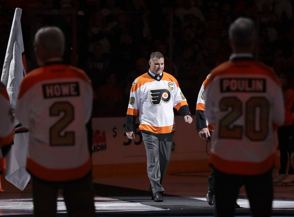 Fourteen members of the Flyers Hall of Fame participated in a pregame ceremony as part of the franchise's 50th anniversary season. They then watched the Flyers allow the first goal for the seventh straight game.