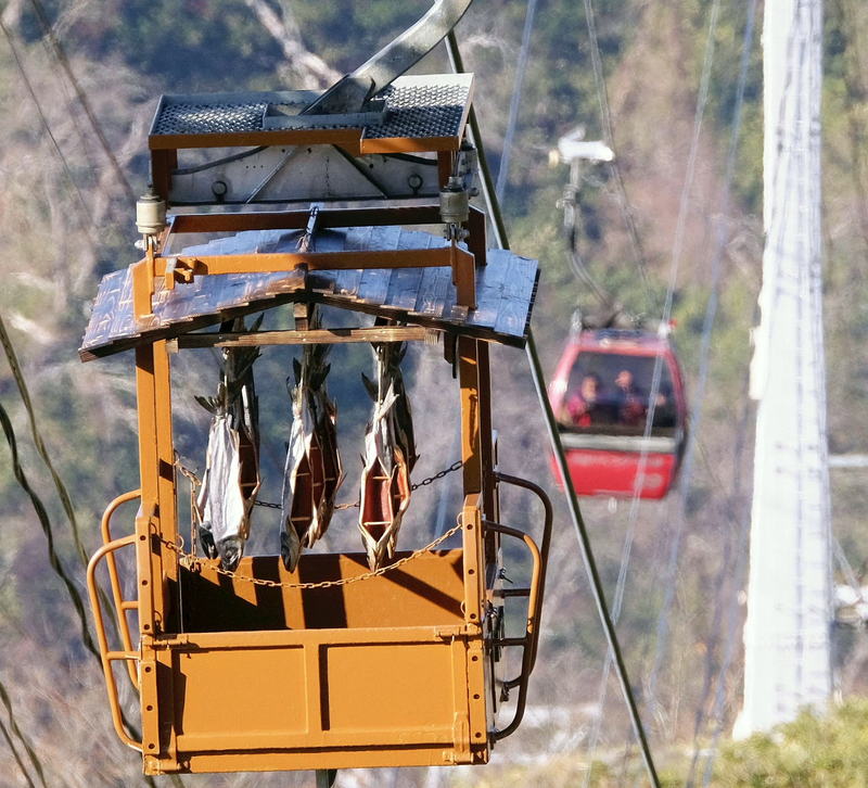 About 20 dried salmon are seen hung in a gondola in Noboribetsu, Hokkaido, on Tuesday. The gondola is used in the process of making saketoba salmon jerky, as exposing the jerky to extreme cold and sunlight for about a week is believe to strengthen its flavor. The gondola carrying the salmon runs between the Noboribetsu Onsen hot spring area and Noboribetsu Bear Park on the summit. The salmon jerky will be sold as food for bears at the park.