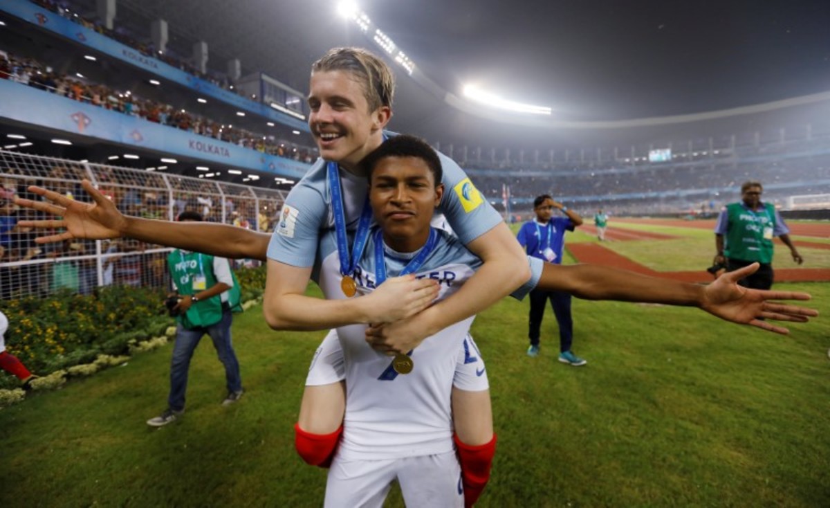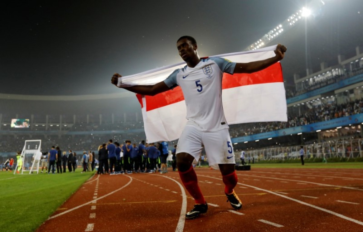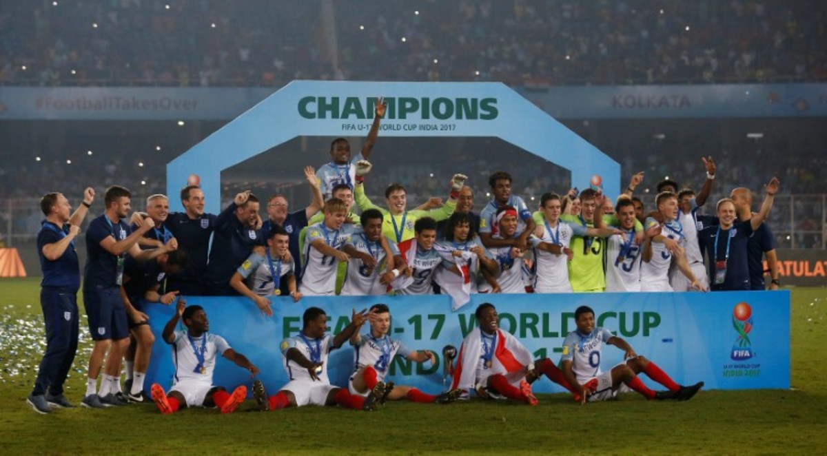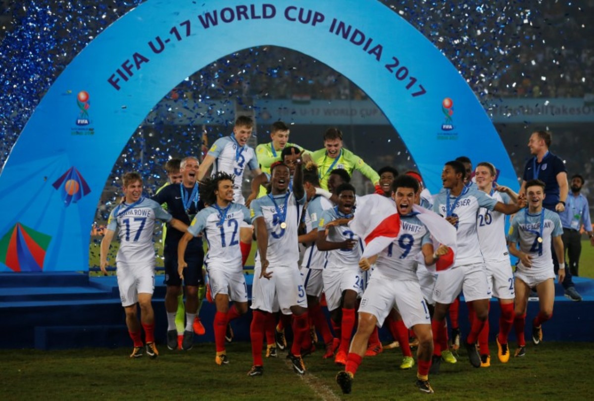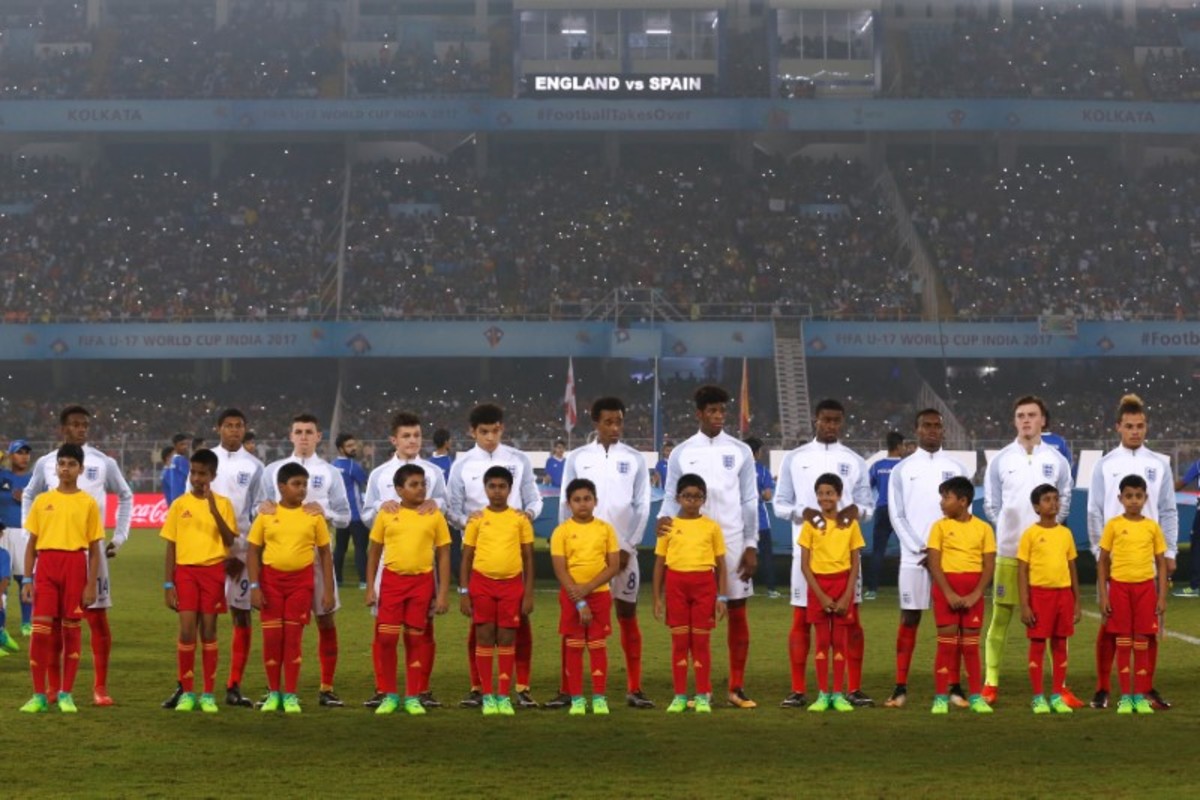 Soccer Football - FIFA Under 17 World Cup Final - England vs Spain - Vivekananda Yuba Bharati Krirangan, Kolkata, India - October 28, 2017 England’s Angel Gomes celebrates with the trophy after winning the 2017 FIFA U-17 World Cup REUTERS/Danish SiddiquiSoccer Football - FIFA Under 17 World Cup Final - England vs Spain - Vivekananda Yuba Bharati Krirangan, Kolkata, India - October 28, 2017 England celebrate winning the 2017 FIFA U-17 World Cup REUTERS/Danish SiddiquiSoccer Football - FIFA Under 17 World Cup Final - England vs Spain - Vivekananda Yuba Bharati Krirangan, Kolkata, India - October 28, 2017 England’s Philip Foden celebrates scoring a goal with teammates REUTERS/Danish SiddiquiSoccer Football - FIFA Under 17 World Cup Final - England vs Spain - Vivekananda Yuba Bharati Krirangan, Kolkata, India - October 28, 2017 England’s Marc Guehi celebrates winning the 2017 FIFA U-17 World Cup REUTERS/Danish SiddiquiSoccer Football - FIFA Under 17 World Cup Final - England vs Spain - Vivekananda Yuba Bharati Krirangan, Kolkata, India - October 28, 2017 England’s Rhian Brewster and Conor Gallagher celebrate winning the 2017 FIFA U-17 World Cup REUTERS/Danish SiddiquiSoccer Football - FIFA Under 17 World Cup Final - England vs Spain - Vivekananda Yuba Bharati Krirangan, Kolkata, India - October 28, 2017 England’s Morgan Gibbs White in action with Spain’s Hugo Guillamon REUTERS/Danish SiddiquiSoccer Football - FIFA Under 17 World Cup Final - England vs Spain - Vivekananda Yuba Bharati Krirangan, Kolkata, India - October 28, 2017 England’s Steven Sessegnon in action with Spain’s Sergio Gomez REUTERS/Danish SiddiquiSoccer Football - FIFA Under 17 World Cup Final - England vs Spain - Vivekananda Yuba Bharati Krirangan, Kolkata, India - October 28, 2017 England’s Rhian Brewster celebrates scoring their first goal REUTERS/Danish SiddiquiSoccer Football - FIFA Under 17 World Cup Final - England vs Spain - Vivekananda Yuba Bharati Krirangan, Kolkata, India - October 28, 2017 Spain’s Abel Ruiz and Hugo Guillamon celebrate after Sergio Gomez scores their second goal REUTERS/Danish SiddiquiSoccer Football - FIFA Under 17 World Cup Final - England vs Spain - Vivekananda Yuba Bharati Krirangan, Kolkata, India - October 28, 2017 Spain’s Sergio Gomez in action REUTERS/Danish SiddiquiSoccer Football - FIFA Under 17 World Cup Final - England vs Spain - Vivekananda Yuba Bharati Krirangan, Kolkata, India - October 28, 2017 England’s Joel Latibeaudiere and Marc Guehi in action REUTERS/Danish SiddiquiSoccer Football - FIFA Under 17 World Cup Final - England vs Spain - Vivekananda Yuba Bharati Krirangan, Kolkata, India - October 28, 2017 England’s Marc Guehi in action with Spain’s Abel Ruiz REUTERS/Danish SiddiquiSoccer Football - FIFA Under 17 World Cup Final - England vs Spain - Vivekananda Yuba Bharati Krirangan, Kolkata, India - October 28, 2017 England players line up during the national anthem before the match REUTERS/Danish SiddiquiSoccer Football - FIFA Under 17 World Cup Final - England vs Spain - Vivekananda Yuba Bharati Krirangan, Kolkata, India - October 28, 2017 Spain players line up during the national anthem before the match REUTERS/Danish SiddiquiSoccer Football - FIFA Under 17 World Cup Final - England vs Spain - Vivekananda Yuba Bharati Krirangan, Kolkata, India - October 28, 2017 England team group before the match REUTERS/Danish Siddiqui