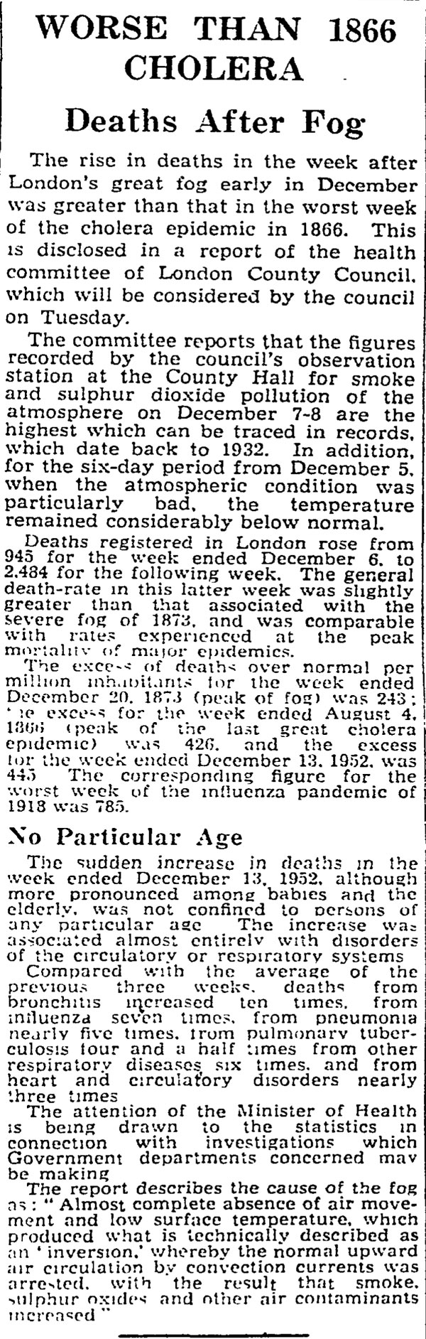 Many of the excess deaths recorded following the fog were from respiratory disease caused or aggravated by toxic sulphur dioxide and other contaminants in the air.