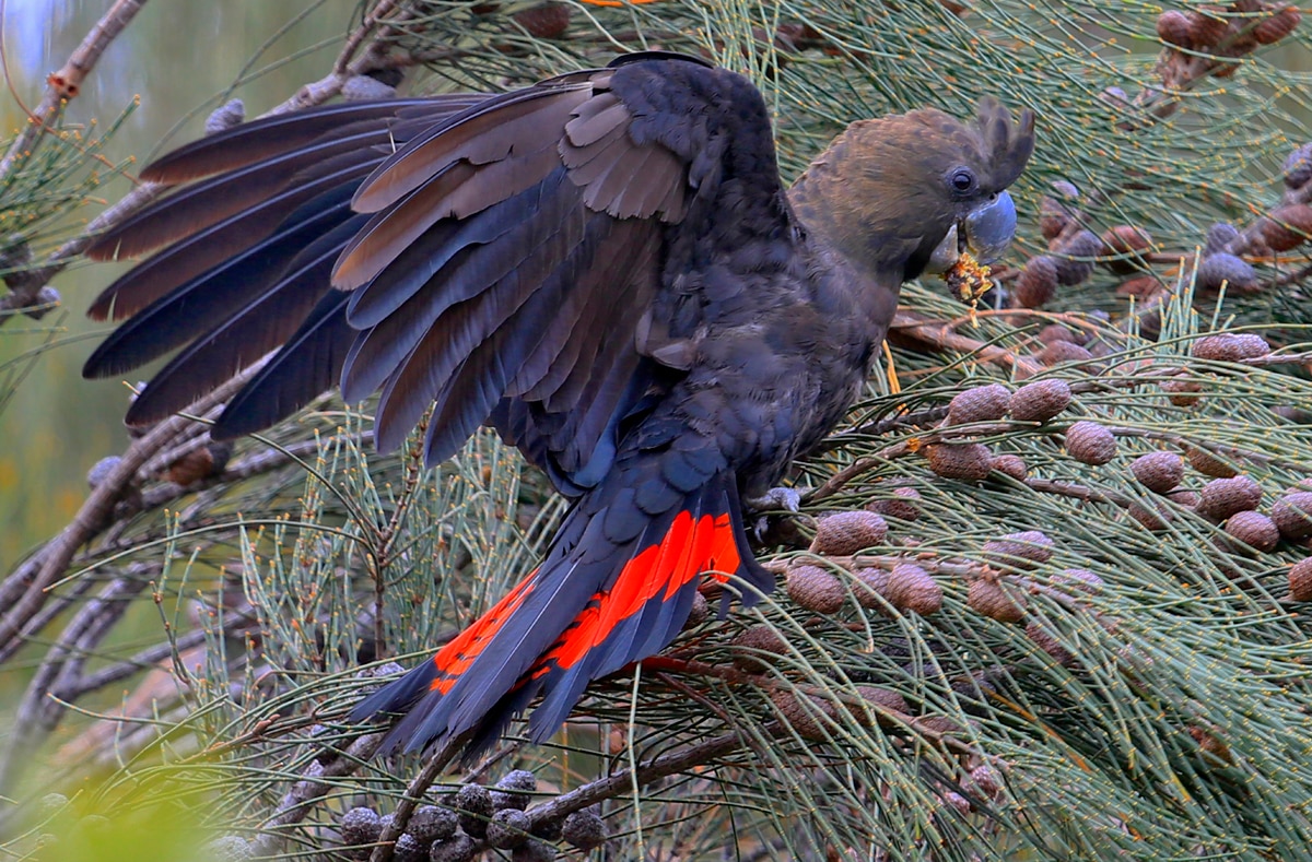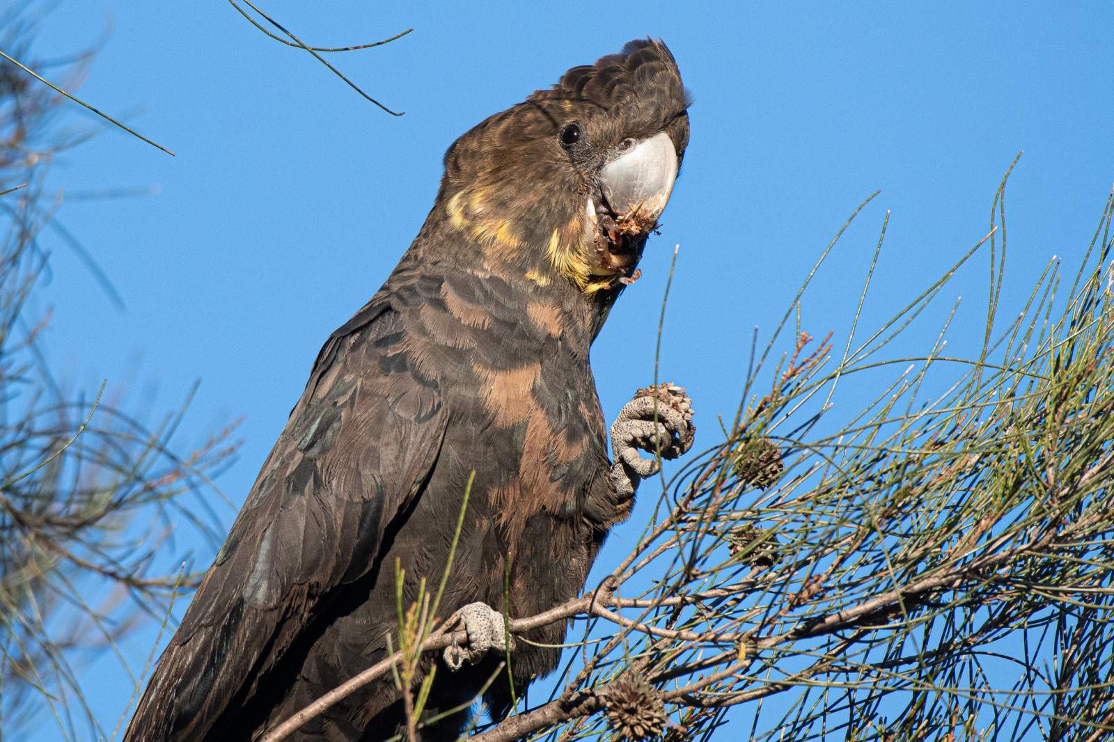The glossy black-cockatoo feeds exclusively on the nuts of the native tree Allocasuarina diminuta, commonly known as she-oaks, a species found in the Conimbla National Park near Cowra.