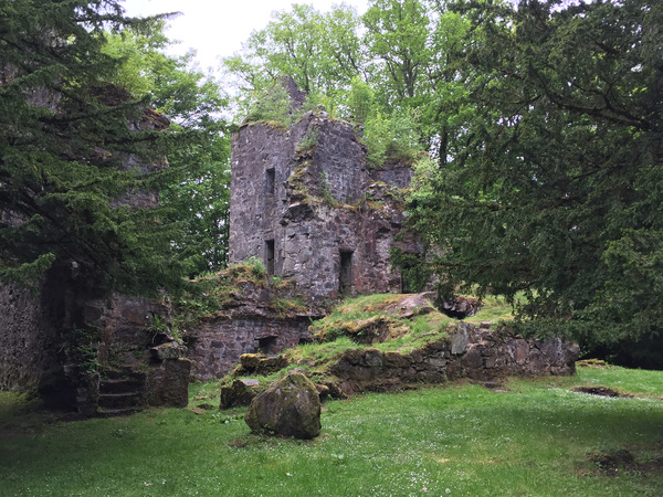 Just one mile from Killin's center, Finlarig Castle stands nearly invisible, hidden by a century's worth of birch and sycamore trees. They say that Rob Roy first took shelter here with the Campbell clan in 1713 not long after being declared an outlaw. The four-story stone sanctuary stood precariously, its time-worn edifice crumbling. A disintegrating spiral staircase led to nowhere, stopping abruptly at chest height. Ferns and ivy threatened to rip apart what remained of 300-year-old archways.