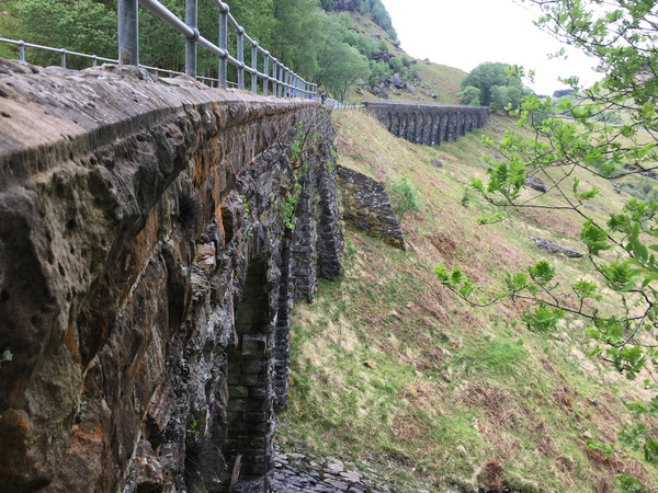 While Rob Roy's life ended in Balquhidder, the trail named for him does not. I continued eastward and upward, past the mirrored surface of Loch Earn, its banks dotted white with sheep. I continued over the stone arches of the Glen Ogle viaduct and through Glen Ogle itself, a steep gorge with a narrow stone footpath at its bottom _ the remains of an old military road built around 1700, used by royal troops to search out Scottish Jacobites like Rob Roy.