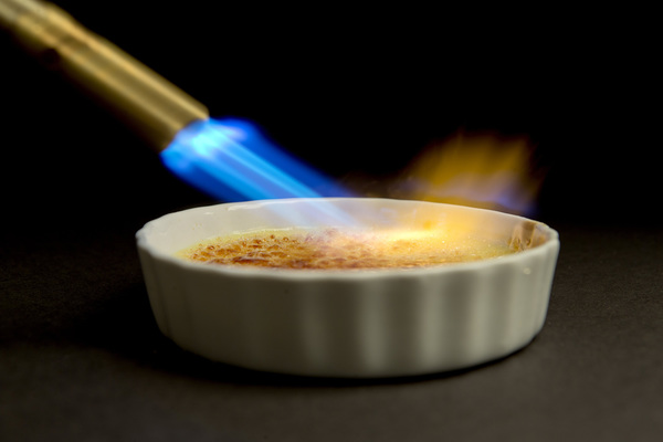 A great creme brulee hinges on two factors. The first is cooking the custard gently, placing it in a water bath as it bakes to keep it from getting too hot. The second is going easy on the sugar before caramelizing it; you want the crust on top to be delicately brittle.