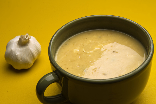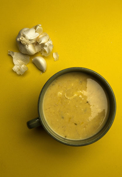 The ingredient in this case is garlic. Simply heating the garlic slowly in olive oil removes its distinctive bite. What is left is a warm and mild flavor that gently permeates the soup without becoming assertive. An addition of egg at the end, like egg drop soup, turns the soup creamy and gives it a luxuriant texture.