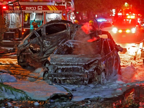 Security forces, firefighters and medics can be seen picking their way through the bombed-out remains after a woman was killed in Rishon LeZion, just south of Tel Aviv.