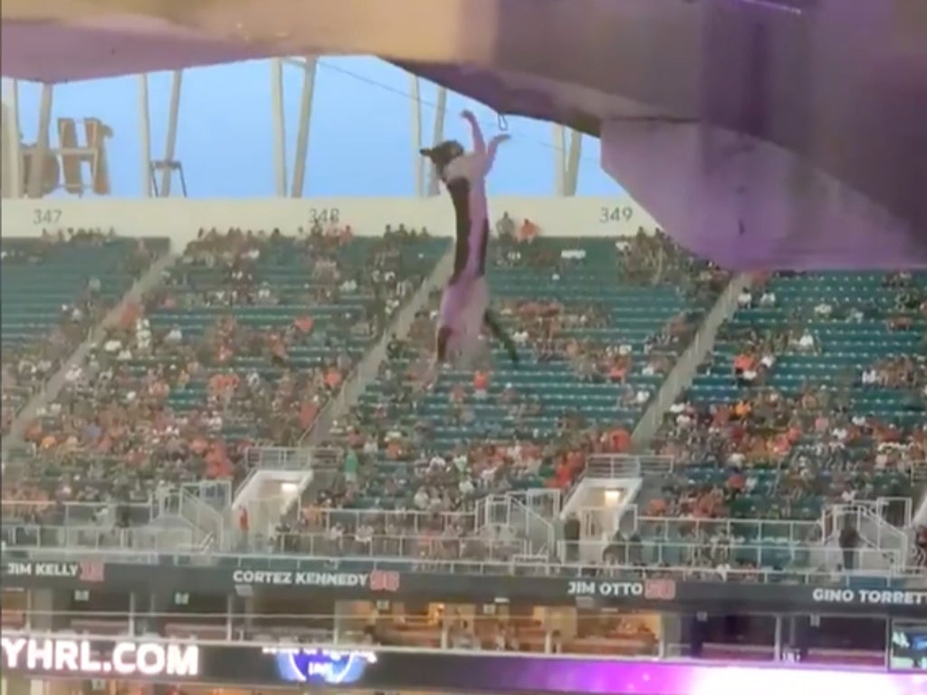 Craig Cromer and his wife, Kimberly, were at the Hard Rock Stadium on Saturday for the first game of the season between the University of Miami Hurricanes and Appalachian State. During the game a cat, of unknown provenance, was spotted dangling from the upper deck.