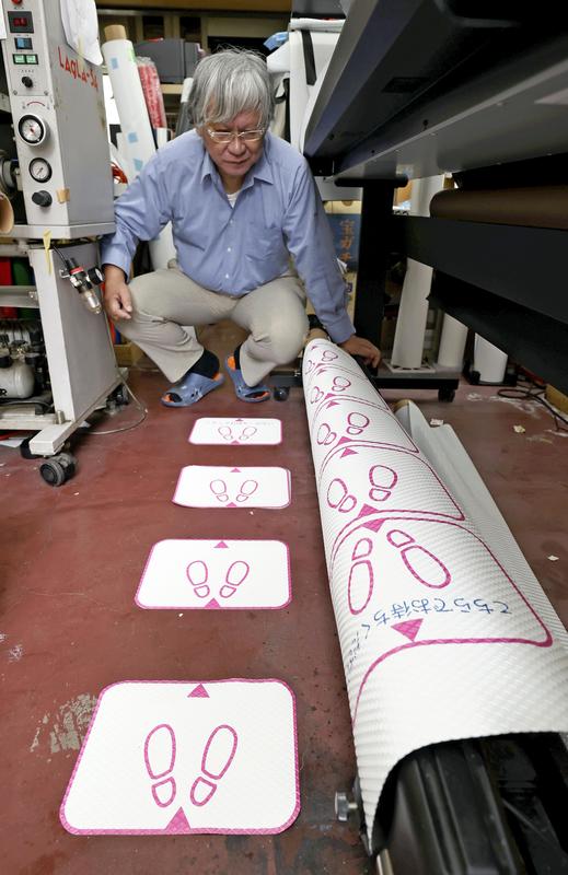 Signboard and anti-slip mat maker in Itabashi Ward, Tokyo, is busy manufacturing mats with footprints printed on them. These mats will remind users to maintain social distance by instructing them where to stand in line to prevent the further spread of the coronavirus.