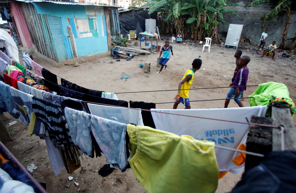 Remi Bamba scores a goal during a football match in a street of a neighborhood in Abidjan, Ivory Coast May 21, 2018. REUTERS/Luc Gnago