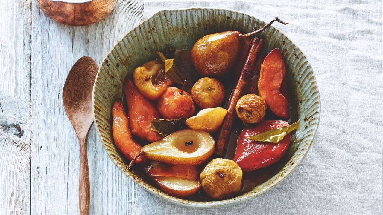 This bay and cinnamon baked fruit dish couldn’t be simpler or more beautiful – apples, pears and quinces slowly baked with honey, citrus, and warm spices until tender and fragrant. Serve with custard, whipped cream, or ice cream.