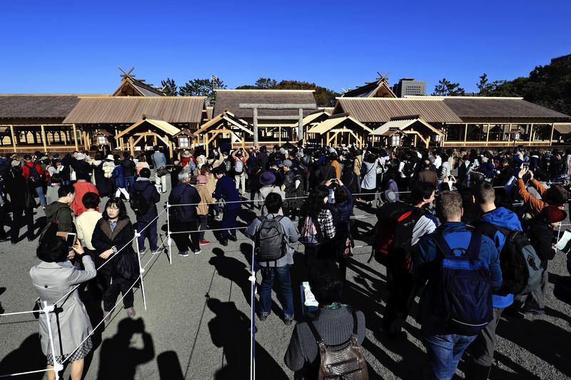 Visitors take photos of the Daijokyu, a set of halls built at the Imperial Palace in Tokyo, after the halls were opened to the public on Thursday. The site was created for the Daijosai thanksgiving ceremony and consists of nearly 40 large and small wooden structures on premises measuring 90 meters by 90 meters. About 1,400 people were waiting for the gates to open at the Imperial Palace on Thursday morning. The Daijokyu will be dismantled after their public exhibition ends on Dec. 8.
