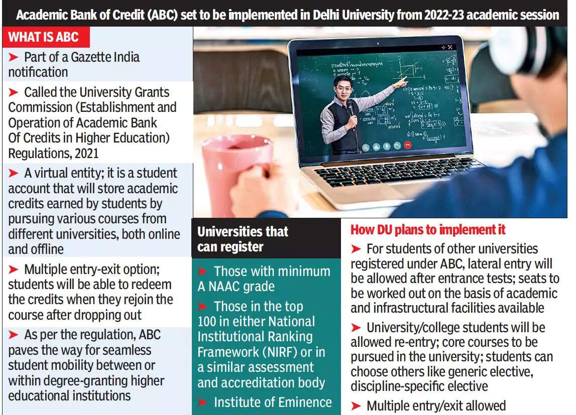 NEW DELHI: While implementing the Academic Bank of Credit (ABC) scheme announced by Prime Minister Narendra Modi from the 2022-23 academic session, Delhi University will conduct entrance tests for students from other universities seeking lateral entry but its own students will be given direct entry.