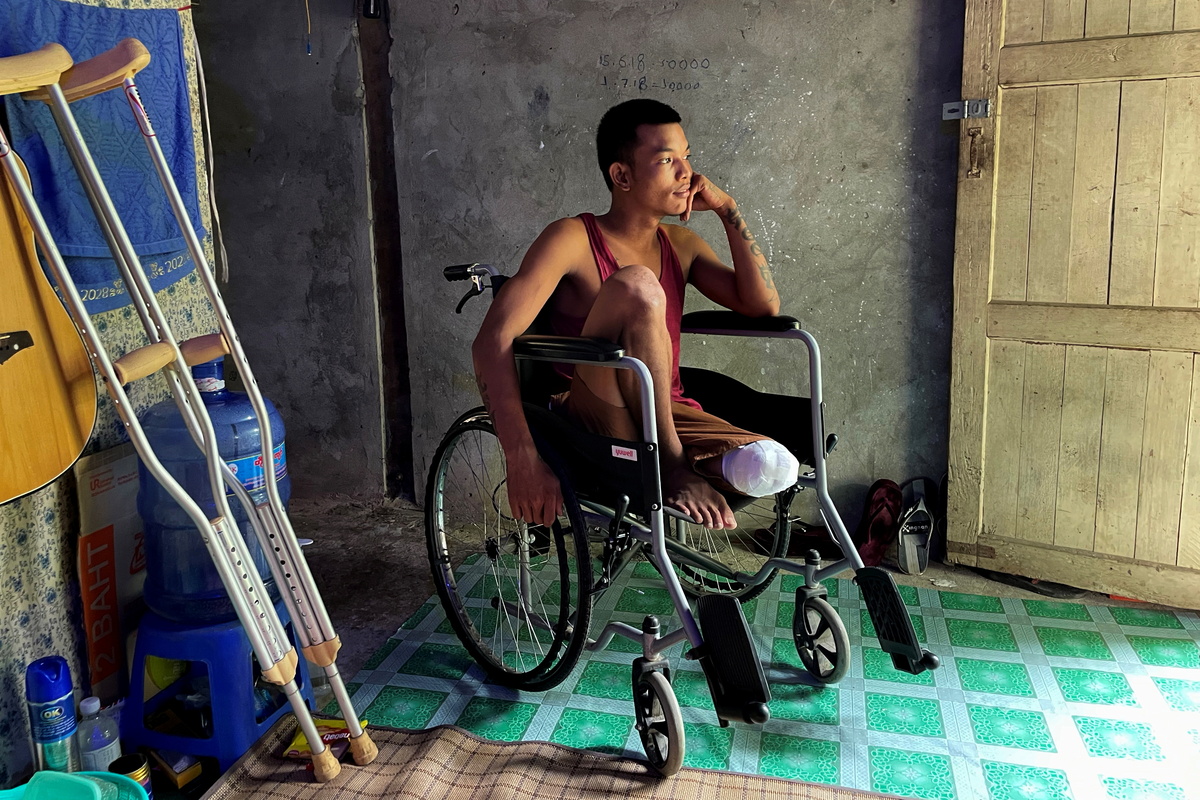 Each morning, Ko Phyo washes himself and his two-year-old son while seated on a chair, a plastic bag covering what remains of a thigh that he says was shattered by a bullet fired by a Myanmar soldier.