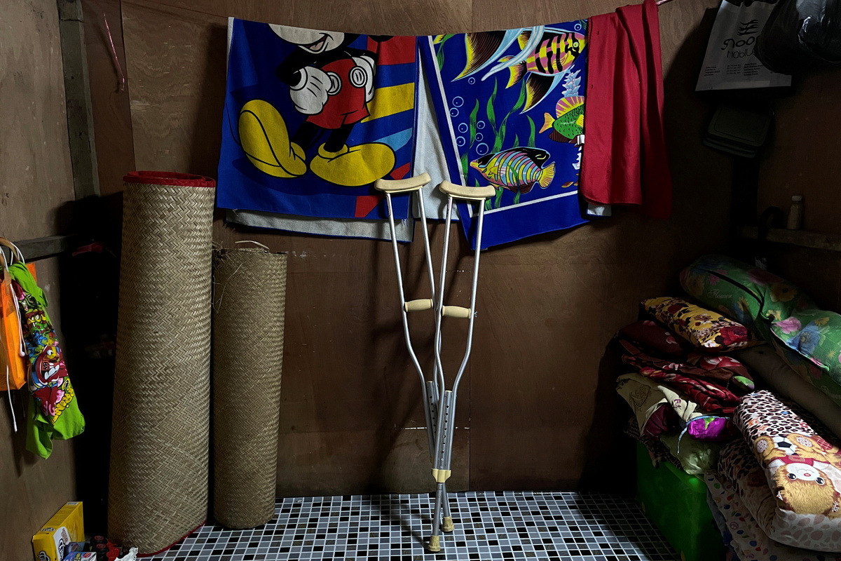 Crutches belonging to Ko Phyo, 24, a protester who lost one leg during an anti-coup protest, are seen inside his bedroom on the outskirts of Yangon, Myanmar, May 22, 2021. REUTERS/Stringer
