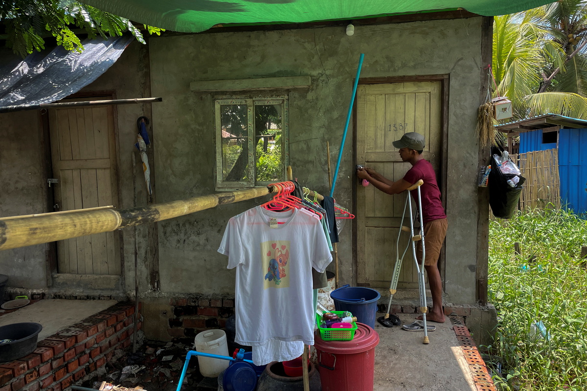 Ko Phyo, 24, a protester who lost one leg during an anti-coup protest, locks his home as he stands with crutches on the outskirts of Yangon, Myanmar, May 4, 2021. Ko Phyo has been learning to become mobile in a wheelchair in his three-room home and uses crutches when outdoors to deal with the uneven roads and paths that run between the green fields of his Yangon township. REUTERS/Stringer