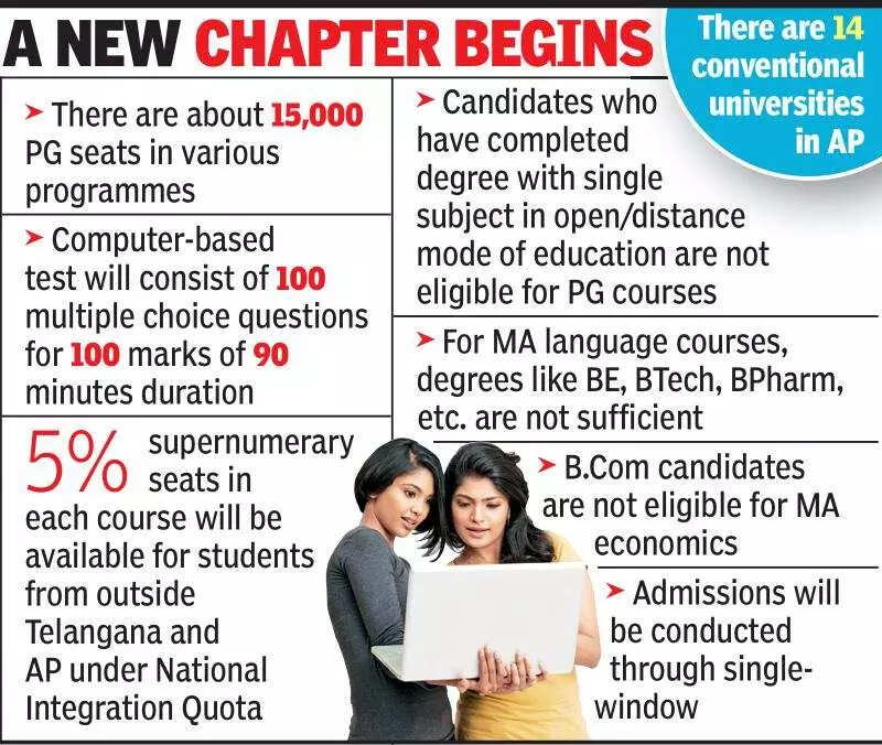 VISAKHAPATNAM: For the first time in its history, the Andhra Pradesh State Council of Higher Education (APSCHE) is conducting a common entrance test to fill the postgraduate seats in courses like MSc, MCom, MA, MPEd, MFA, etc. in all the universities of the state.